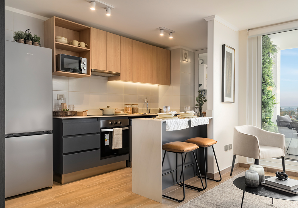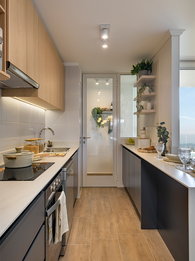 Cocina abierta o cerrada, según modelo, con moderno y funcional diseño, equipada con cubierta de porcelanato, full electric, muebles aéreos con iluminación led y logia cerrada.