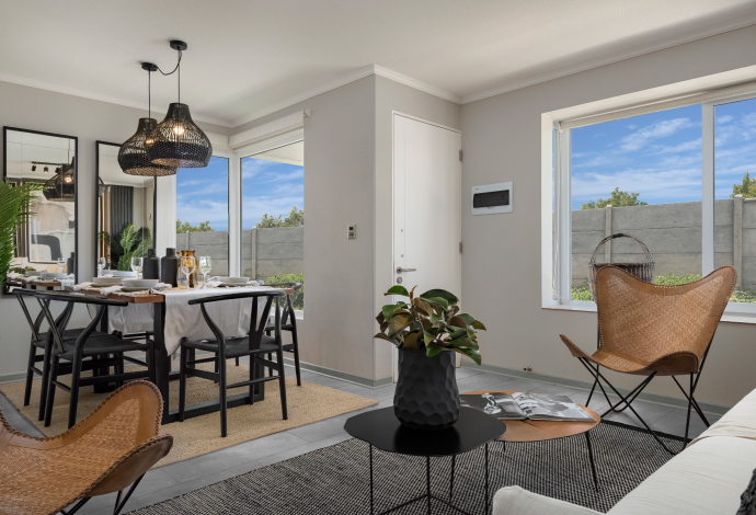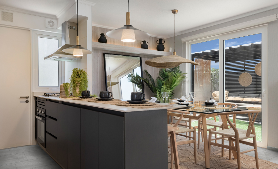 Elegimos las mejores terminaciones para que tu casa sea más cómoda y funcional: piso monopavimento, cocina con cubierta de porcelanato, ventanas con marco de PVC y revestimiento térmico, creando ambientes más agradables.